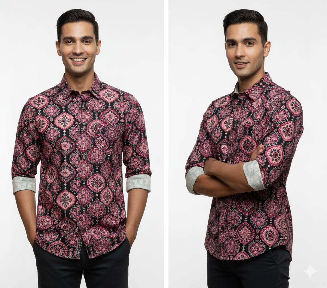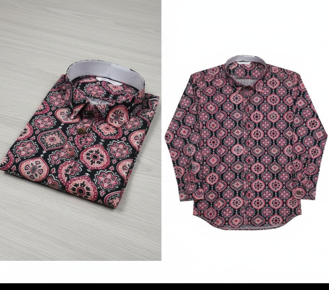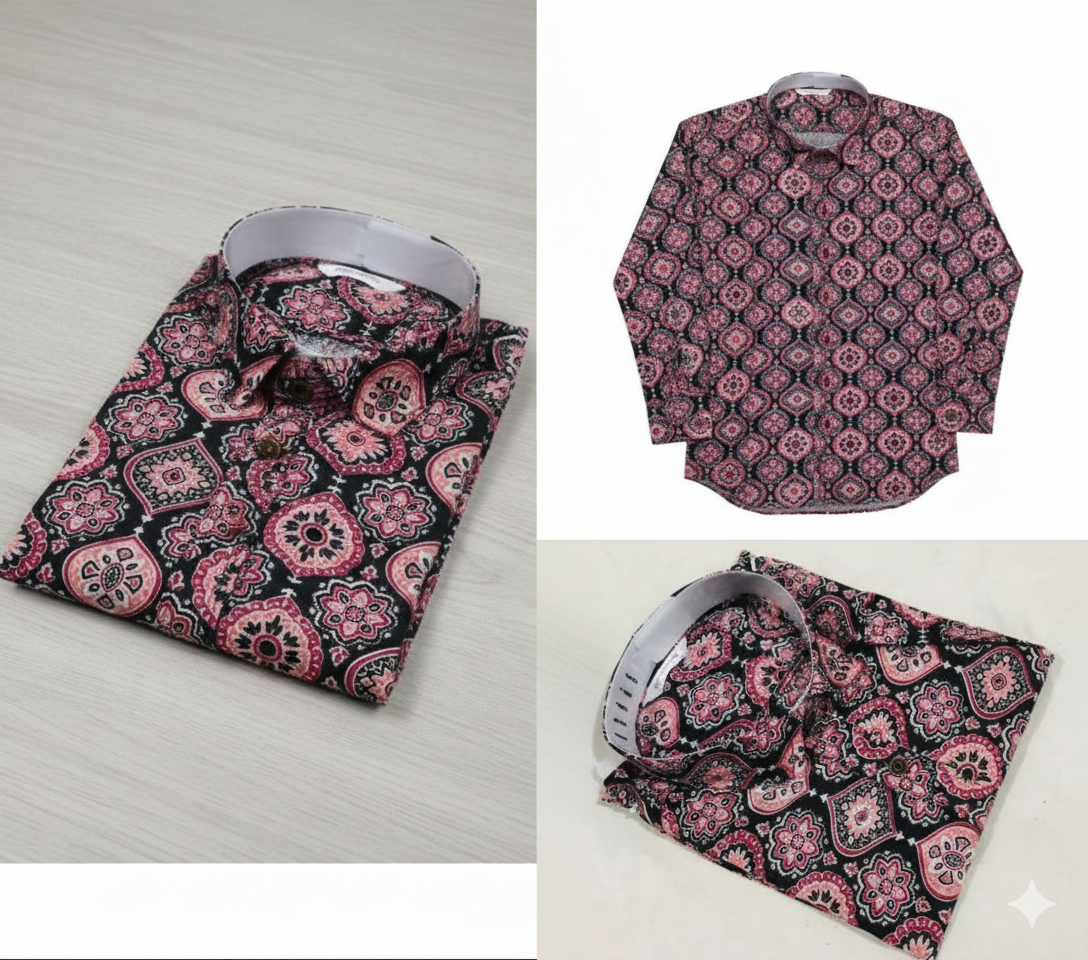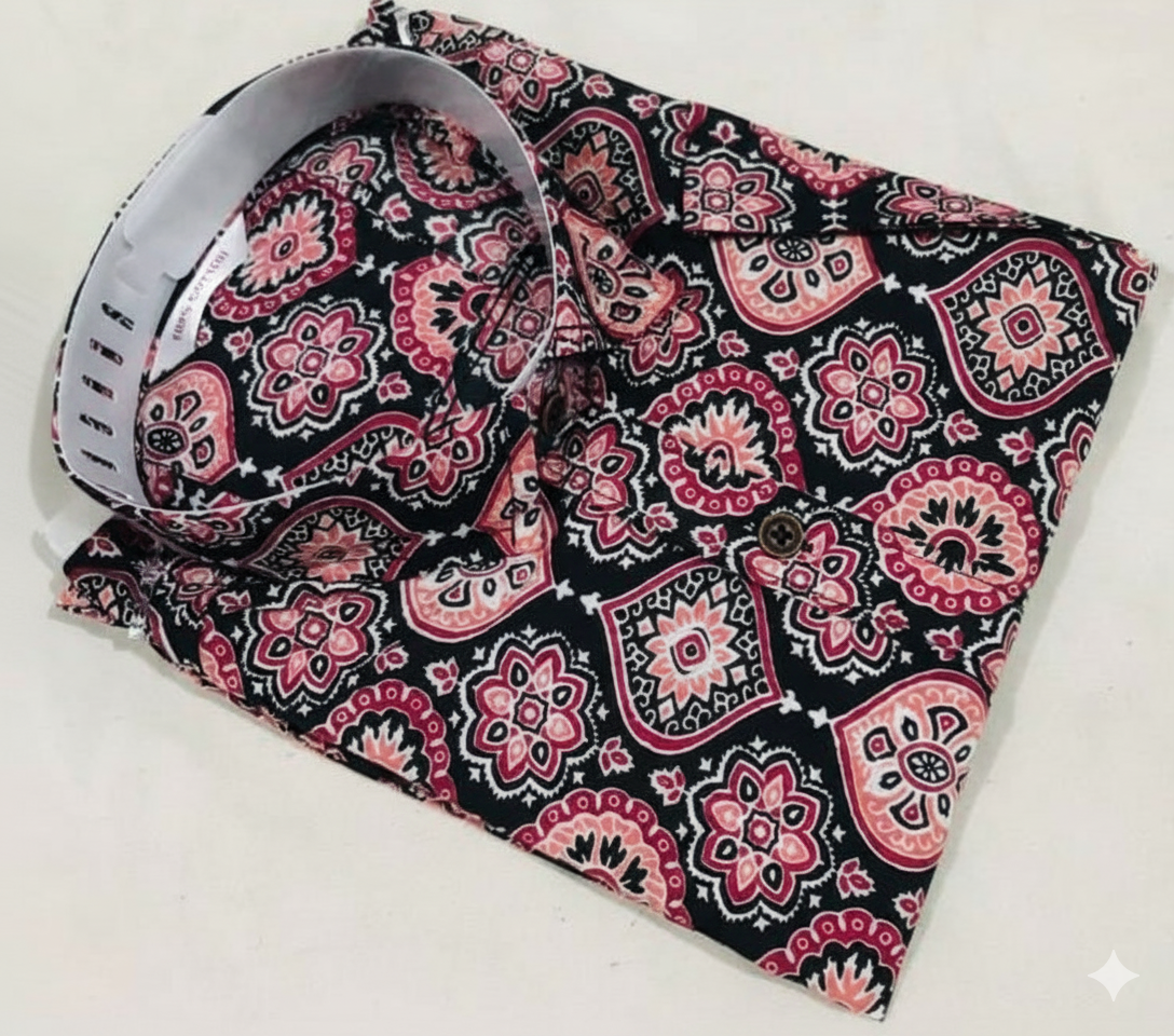 Add a pop of color and cultural flair to your wardrobe with our Men's Jaipuri Sanganeri Print Cotton Shirt. This eye-catching black shirt features exquisite hand block printed floral and paisley motifs in shades of pink, maroon, and peach. Handcrafted in Jaipur, Rajasthan, it's a perfect blend of traditional artistry and modern casual style, ideal for making a unique statement.