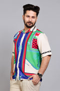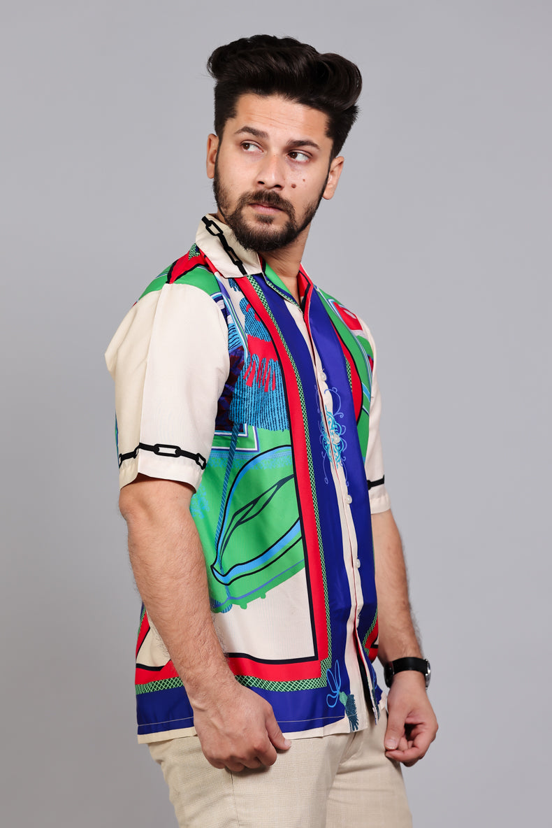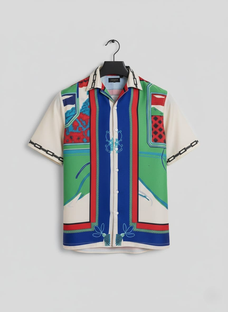 Design & Details: This shirt features a symmetrical vertical panel construction in cream, royal blue, and vibrant green, accented by deep red borders. Key details include a structured open collar, intricate scrolling motifs at the chest and hem, and a distinctive chain-link graphic border on the sleeves.