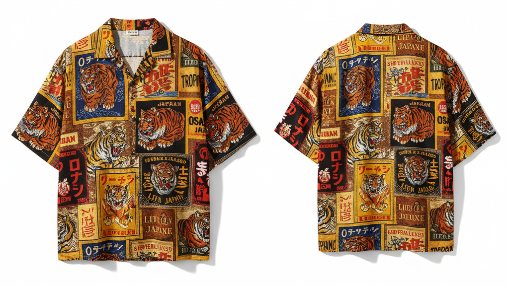Oversized Digital Print "Osaka Tiger Retro" Men's Hawaiian Shirt - Multi-Panel Graphic