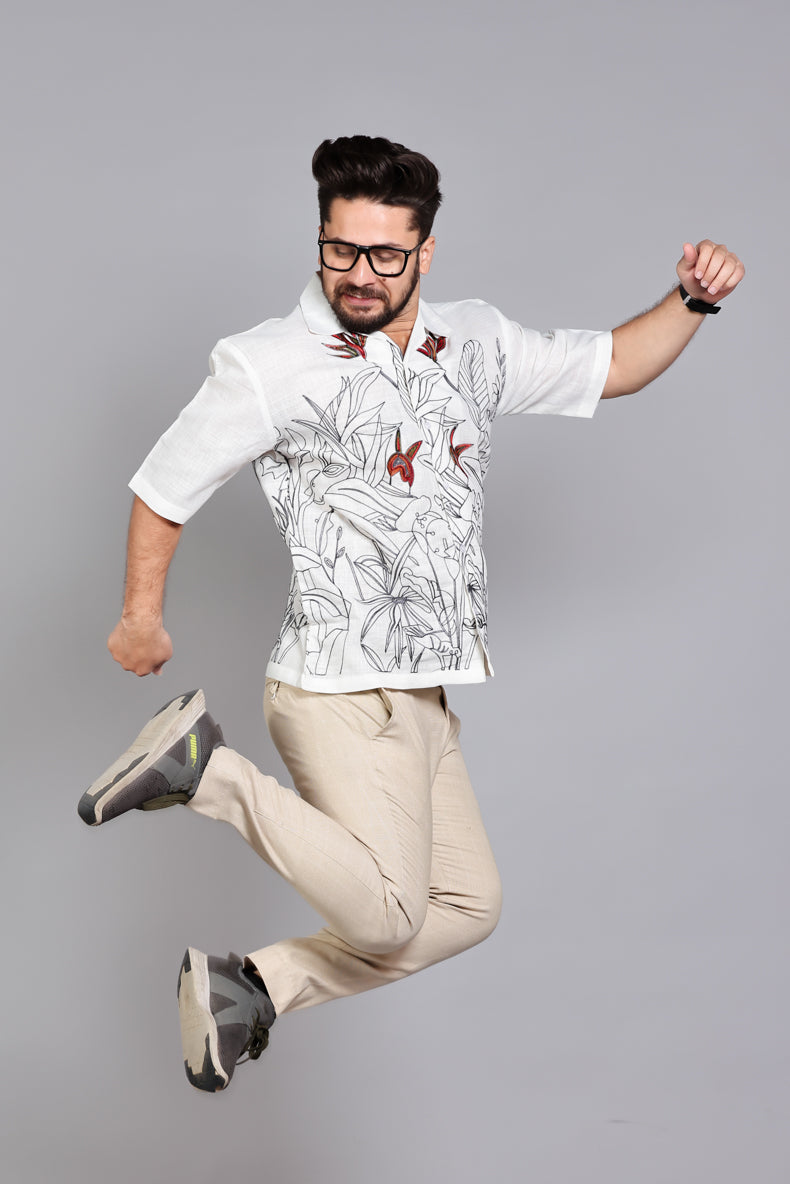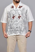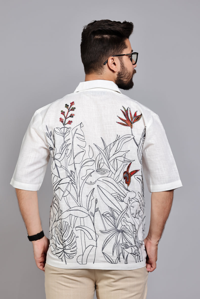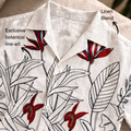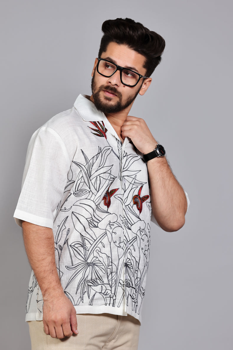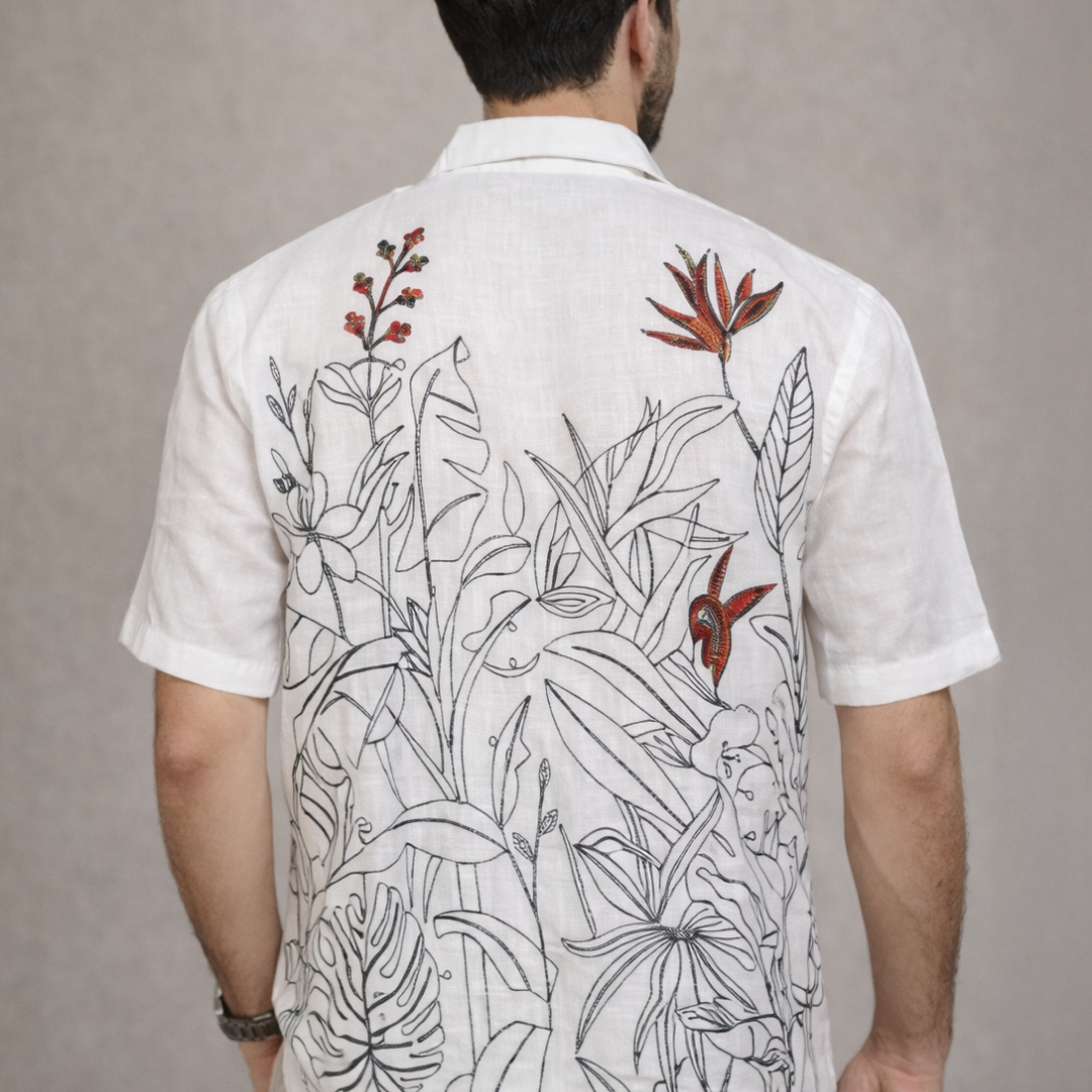 Design & Details :The shirt serves as a canvas for high-contrast tropical flora illustrations, complemented by delicate floral embroidery in earthy tones near the shoulders. It features a relaxed Cuban-style open collar, a clean-finished button placket, and precise stitching for a contemporary, resort-ready silhouette.