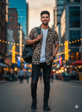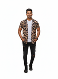 Make a bold statement with our Men's Sanganeri-Style Leopard Print Shirt. This unique and modern casual shirt features an abstract animal pattern in shades of black, brown, and purple on a light tan base. While a contemporary design, it is created using the traditional hand block printing technique, offering a stylish fusion of modern art and ancient craftsmanship.